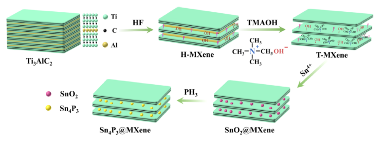 3納米顆粒組成的集成電極,夾在過(guò)渡金屬碳化物(MXene)納米片之間。四甲基氫氧化銨(TMAOH)通過(guò)產(chǎn)生帶有擴(kuò)展層間距的MXene負(fù)電荷片,在這種夾層結(jié)構(gòu)的形成中發(fā)揮了重要作用。強(qiáng)大的C-O-P氧橋接鍵使得Sn
