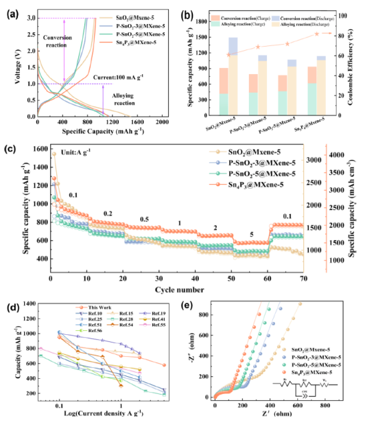 3@MXene-5電極與其他Sn基材料的速率性能的比較,(e)新電極的奈奎斯特圖。