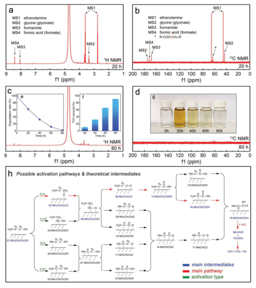 13C NMR譜;e)乙醇胺降解率(%)和f) TOC去除率(%)與反應(yīng)時(shí)間的函數(shù)關(guān)系;G)電氧化0、20、40、60和80 h后陽極電解質(zhì)的照片;H)乙醇胺氧化的機(jī)理。