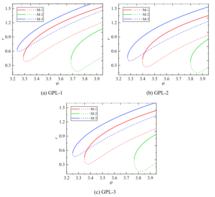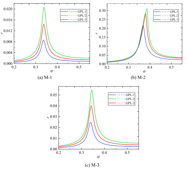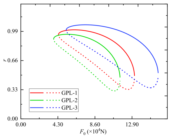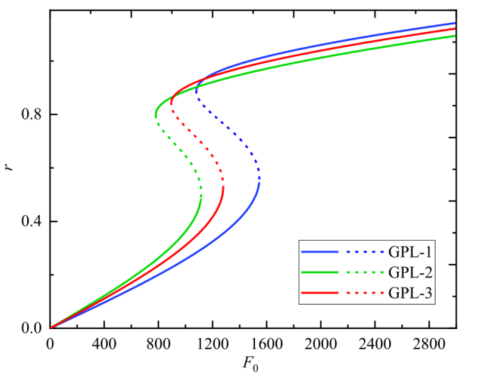 圖8. 不同GPL時(shí)主共振力響應(yīng)曲線。