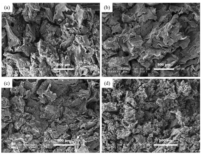圖3. 不同GR含量(a) 10.8% wt%;(b) 15.9 wt %;(c) 27.1 wt %;(d) 36.9 wt %的PU1/PDA/GR泡沫復(fù)合材料的SEM圖像。