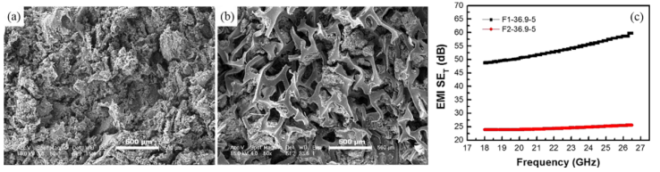 圖6. (a) F1-36.9-5泡沫復(fù)合材料的SEM圖像;(b) F2-36.9-5泡沫復(fù)合材料的SEM圖像;(c) F1-36.9-5和F2-36.9-5泡沫復(fù)合材料的EMI SE對比曲線。