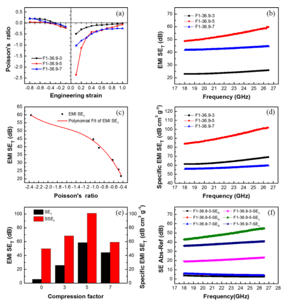 圖8. (a)不同壓縮系數(shù)的F1-36.9-Y泡沫復(fù)合材料的泊松比與工程應(yīng)變關(guān)系;(b) 不同壓縮系數(shù)的F1-36.9-Y泡沫復(fù)合材料的EMI SE對比曲線;(c) PU1/PDA/GR泡沫復(fù)合材料的EMI SE與泊松比的關(guān)系;(d)不同壓縮系數(shù)的F1-36.9-Y泡沫復(fù)合材料的比EMI SE (EMI SSE)對比曲線;(e)不同壓縮系數(shù)的F1-36.9-Y泡沫復(fù)合材料在26 GHz時的EMI SE和EMI SSE對比曲線;(f)不同壓縮系數(shù)的F1-36.9-Y泡沫復(fù)合材料的SER和SEA曲線。
