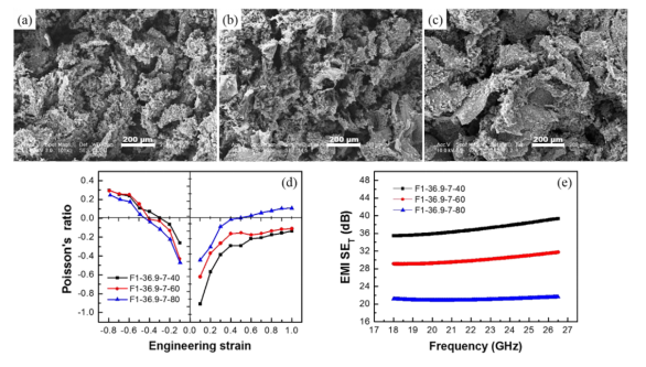 圖11. F1-36.9-7泡沫復(fù)合材料在不同溫度下加熱1小時的SEM圖像(a)40℃; (b)60℃; (c)80℃;(d) F1-36.9-7泡沫復(fù)合材料在不同溫度下加熱1 h泊松比與工程應(yīng)變的關(guān)系;(e) F1-36.9-7泡沫復(fù)合材料在不同溫度下加熱1 h的EMI SE對比曲線。