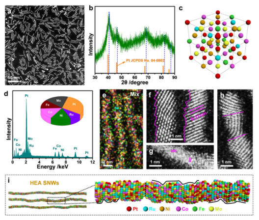 Figure 1. HEA SNWs 的表征。a HAADF-STEM 圖。b XRD圖。c 晶體結(jié)構(gòu)。d SEM-EDS 和不同元素的原子比。e HAADF-STEM-EDS 元素映射。f-h 球差校正的HRSTEM圖。i 3D模型和HEA SNWs的放大原子模型。