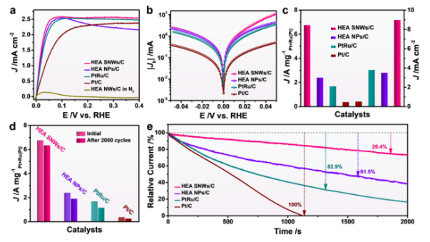 Figure 2. HEA SNWs/C和其他催化劑的HOR性能評(píng)估。a 極化曲線。b 塔菲爾圖。c 歸一化的質(zhì)量和面積比活性。d 2000次循環(huán)前后的質(zhì)量活性比較。e 不同催化劑在1000 ppm CO/H2飽和的0.1 M KOH電解液中,相對(duì)電流-時(shí)間計(jì)時(shí)電流響應(yīng)。