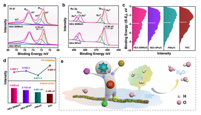 Figure 3. 表面價(jià)帶光電子能譜分析。A Pt 4f XPS光譜。b Ru 3p XPS光譜。c 不同催化劑的d帶中心。 d不同催化劑的CO剔除電位和d帶中心位置。e在HEA SNWs/C催化劑上發(fā)生HOR的示意圖。