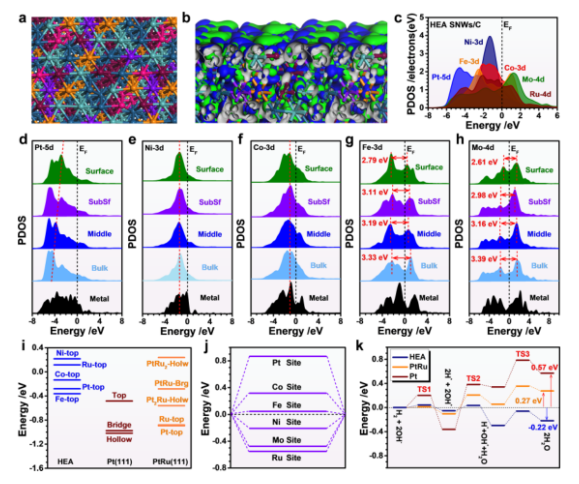 Figure 4. HEA SNWs上HOR 路徑的DFT計(jì)算。a優(yōu)化的幾何結(jié)構(gòu)頂視圖。b 費(fèi)米能級(jí)附近電子分布的3D等高線圖。c PDOS。d-h PDOS。i 不同位點(diǎn)上的HBE比較。j HEA SNWs/C中不同位點(diǎn)上的OH結(jié)合能。k 在HEA SNWs/C、Pt (111) 和PtRu (111)上的HOR能量趨勢(shì)。