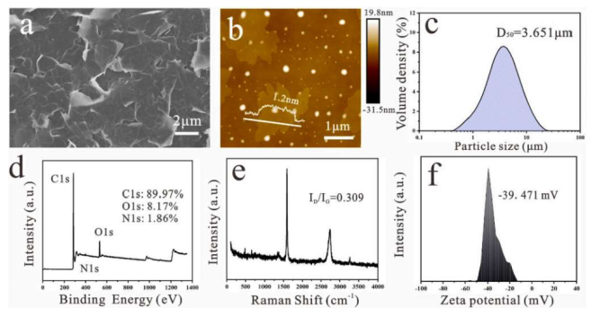 圖3. 石墨烯的(a) SEM圖像;(b) AFM圖像;(c)尺寸分布;(d) XPS譜;(e)拉曼光譜;(f)電動(dòng)電勢。