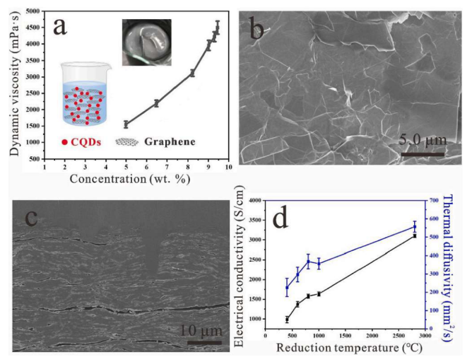 圖5. (a)石墨烯漿料濃度與粘度的關(guān)系;(b)石墨烯薄膜表面的SEM圖像;(c)石墨烯薄膜橫截面的SEM圖像;(d)石墨烯薄膜的導(dǎo)電性和熱擴(kuò)散率。