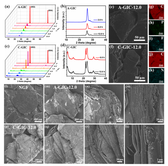 圖3. (a, b和c, d) A-GIC和C-GIC的XRD譜圖。(e-k) A-GIC-12.0和C-GIC-12.0的SEM圖像和EDX映射。(l-s) NGF、A-GIC-12.0和C-GIC12.0的SEM圖像。