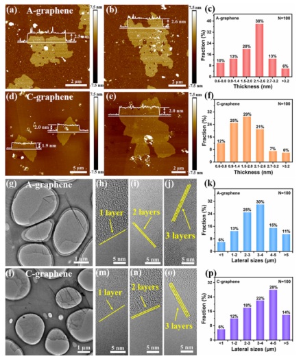 圖5. (a, b和d, e) A-石墨烯薄片和C-石墨烯薄片高度輪廓的AFM圖像。(c和f) A-石墨烯薄片和C-石墨烯薄片的厚度分布直方圖。(g-j, l-o) A-石墨烯薄片和C-石墨烯薄片的TEM電鏡和HR-TEM圖像。(k和p) A-石墨烯薄片和C-石墨烯薄片的尺寸分布直方圖。
