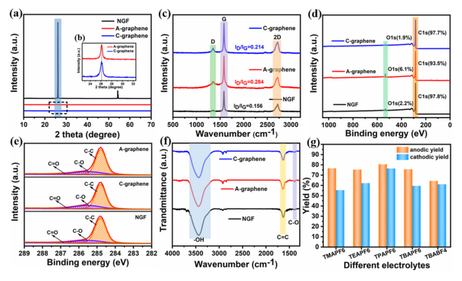 圖6. (a, b, c) NGF、A-石墨烯和C-石墨烯的XRD譜圖和拉曼光譜。(d, e) NGF和A-石墨烯、C-石墨烯的XPS測量光譜和C1s光譜。(f) NGF與A-石墨烯和C-石墨烯的FT-IR光譜。(g)不同電解質(zhì)的陽極和陰極產(chǎn)率直方圖。