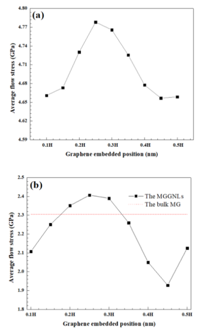 圖3. MGGNLs和MG的平均屈服應(yīng)力隨石墨烯嵌入位置的變化。(a) MGGNLs第一塑性階段的平均屈服應(yīng)力。(b) MGGNLs和MG第二塑性階段的平均屈服應(yīng)力。