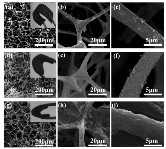 圖3. (a-c) NCF、(d-f) NiO-NCF和(g-i) rGO@NiO-NCF的SEM照片。
