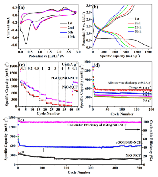 圖5. rGO@NiO-NCF的(a)CV曲線和(b)恒流充放電曲線,(c)在不同電流密度時(shí)NiO-NCF和rGO@NiO-NCF的倍率性能。(d)rGO@NiO-NCF在不同電流密度時(shí)的快速充電和慢放電性能,(e)rGO@NiO -NCF在1A g