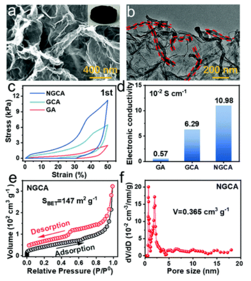 Figure 2. (a) NGCA 的 SEM 和 (b) TEM 圖像。(c) GA、GCA 和 NGCA 的壓縮應(yīng)力-應(yīng)變曲線。(d) GA、GCA 和 NGCA 的電子電導(dǎo)率。(e) N
