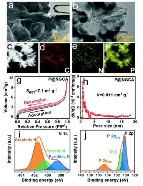 2吸附-解吸等溫線和(h) P@NGCA 的孔徑分布。P@NGCA 的 (i) N 1s 和 (j) P 2p 的高分辨率 XPS 光譜。