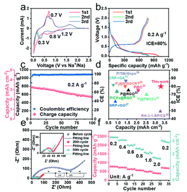 -1下的長(zhǎng)期循環(huán)特性。(d) 本作品與其他材料的比面積比較。(e) 紅P、NGCA 和 P@NGCA 的奈奎斯特圖。(f) P@NGCA 的倍率能力從 0.2 A g