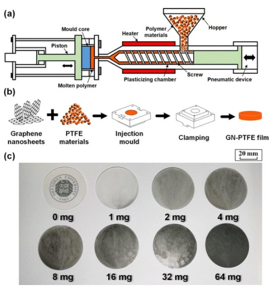 Figure1.使用微注射成型技術(shù)制備聚合物薄膜。 (a) 微注射成型機的工作原理圖。 (b) GN-PTFE 試樣的生產(chǎn)過程。 (c) 添加不同質(zhì)量的石墨烯納米片 (0-64 mg) 制成的 GN-PTFE 樣品的照片。