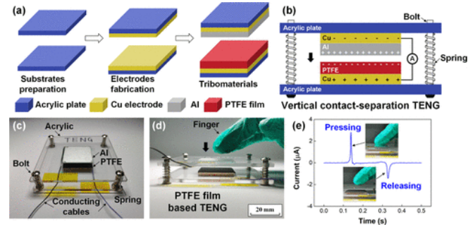 Figure 2. PTFE 薄膜基 TENG 的制備及摩擦起電性能評價。 (a) TENGs的制備過程。 (b) TENGs結(jié)構(gòu)示意圖。 (c) 基于 PTFE 薄膜和鋁箔制造的 TENG 的照片。 (d) 工作頻率為 2 Hz、間距為 4 mm 的 TENG 手指敲擊測試。 (e) TENGs 在一個攻絲循環(huán)中的短路電流。