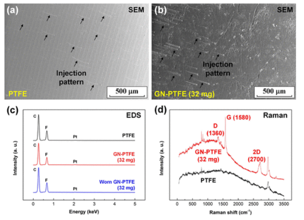Figure 3. 所制備的 PTFE 和 GN-PTFE 薄膜的表征。 (a) 原始 PTFE 薄膜的 SEM 圖像。 (b) GNPTFE 薄膜 (32 mg) 的 SEM 圖像。 (c) PTFE、GN-PTFE 和磨損的 GN-PTFE 薄膜的 EDS 光譜。 (d) PTFE 和 GN-PTFE 薄膜的拉曼光譜。