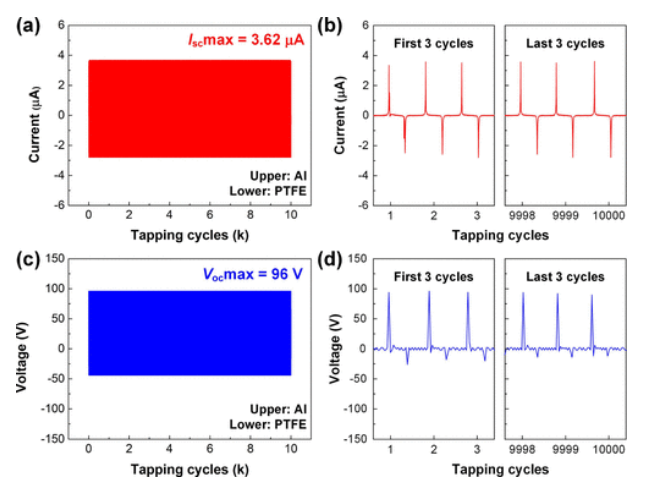 Figure 6. 基于原始 PTFE 薄膜的 TENG 的工作穩(wěn)定性和可重復(fù)性測試經(jīng)歷了 10,000 次手指敲擊循環(huán)。 (a,c) 連續(xù)工作 10,000 次循環(huán)下的輸出短路電流和開路電壓。 (b,d)第一個和最后三個手指敲擊周期的輸出短路電流和開路電壓。