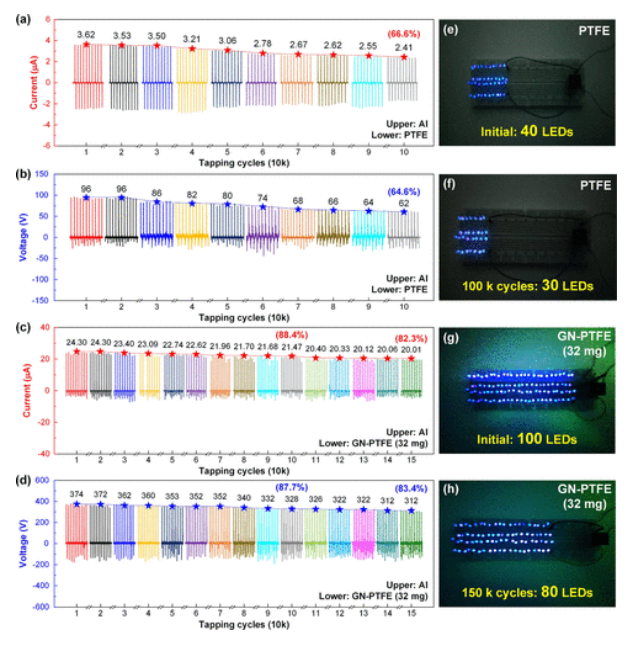 Figure 7. 基于原始 PTFE 和 GN-PTFE 薄膜的 TENG 的長期工作穩(wěn)定性和耐久性測試。 (a,b)基于原始 PTFE 薄膜的 TENG 的短路電流和開路電壓,用于 100,000 次手指敲擊循環(huán)。 (c,d)基于 GN-PTFE 薄膜的 TENG 的短路電流和開路電壓,用于 150,000 次手指敲擊循環(huán)。 (e,f)在測試開始和結(jié)束時用 PTFE TENG 點亮的 LED 燈泡的照片。 (g,h) 在測試開始和結(jié)束時使用 GN-PTFE TENG 點亮 LEDS 燈泡的照片。