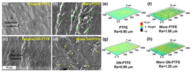 Figure 8. 長期耐久性測試前后 PTFE 和 GN-PTFE(32 mg 石墨烯納米片)薄膜的表面形態(tài)。 (a,b) 原始 PTFE 薄膜和磨損的 PTFE 薄膜的 SEM 圖像。 (c,d)原始 GN-PTFE 薄膜和磨損的 GN-PTFE 薄膜的 SEM 圖像。 (e,f)原始 PTFE 薄膜和磨損的 PTFE 薄膜的 3D 光學(xué)圖像。 (g,h) 原始 GN-PTFE 薄膜和磨損的 GN-PTFE 薄膜的 3D 光學(xué)圖像。