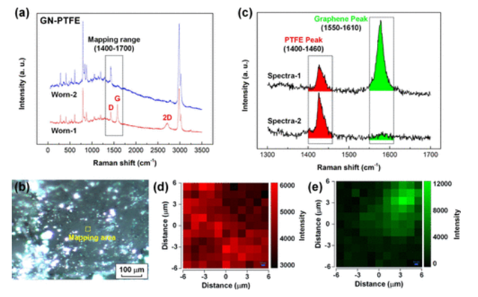 Figure 9. 長期耐久試驗后 GN-PTFE 薄膜磨損表面的拉曼圖分析。 (a) GN-PTFE 薄膜磨損表面的拉曼光譜。 (b) GN-PTFE 薄膜上磨損表面的光學(xué)圖像。拉曼映射區(qū)域由黃色矩形表示(未按比例)。 (c) 用于比較 PTFE 峰和石墨烯峰的拉曼光譜。 (d) PTFE 峰的拉曼映射圖像(紅色)。 (e) 石墨烯峰的拉曼映射圖像(綠色)。