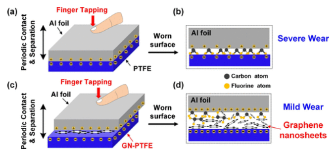 Figure 10. 基于原始 PTFE 和 GN-PTFE 薄膜的垂直接觸分離操作模式 TENG 的磨損機制。 (a,b)基于原始 PTFE 薄膜和鋁箔的 TENG 接觸模型。 (c,d)基于 GN-PTFE 薄膜和鋁箔的 TENG 接觸模型。