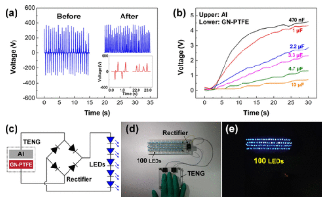 Figure 11. 基于 GN-PTFE 薄膜和鋁箔的 TENG 應(yīng)用演示。 (a) 整流前后輸出開路電壓。插圖顯示了兩個周期內(nèi)電壓的放大圖。 (b) 不同電容器在 30 秒內(nèi)的充電曲線。 (c) 用于為 LED 供電的 TENG 電路圖。 (d) 將 100 個 LED 插入面包板的電路照片。 (e) 點亮的 100 個 LED。