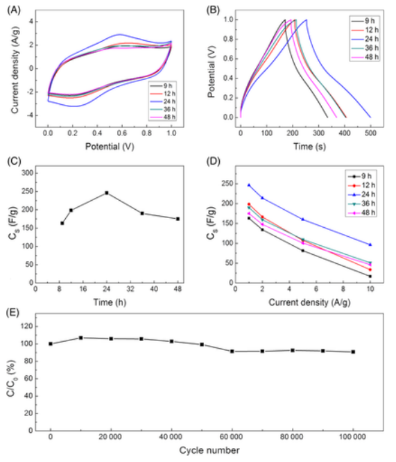 Figure 4. 基于不同還原時(shí)間的 RGO 纖維電極的電化學(xué)性能,在三電極系統(tǒng)中進(jìn)行測(cè)試。 (A) 10 mV s