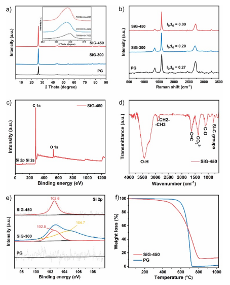 Figure 2. (a)PG、SiG-300 和 SiG-450 的 XRD 圖案(b)。PG、SiG-300 和 SiG-450 的拉曼光譜。(C)。SiG-450的XPS 。(d)。SiG-450 的 FT-IR光譜。(e)。PG、SiG-300 和 SiG-450 的 Si 2p XPS 光譜。(F)。PG和SiG-450的TGA曲線。