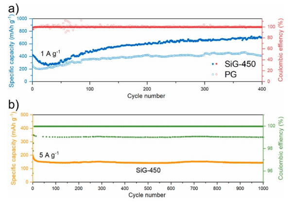 Figure 5. (a) SiG-450在1A/g下的循環(huán)性能 (b) SiG-450在5A/g下的循環(huán)性能。