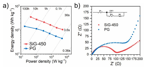 硅/碳復(fù)合材料被發(fā)現(xiàn)是一種防止電池循環(huán)過程中硅材料變質(zhì)的流行策略。在此,通過簡便的合成路線報(bào)道了一種新型的硅摻雜石墨烯材料(SiG),并研究了其在鋰離子電池中的應(yīng)用。微波輻照處理成功地實(shí)現(xiàn)了硅雜原子摻雜到石墨烯晶格中,從而使原始石墨烯的比容量增加了一倍。更重要的是,SiG 表現(xiàn)出循環(huán)后鋰離子存儲(chǔ)和擴(kuò)散的改善,以及能量密度和功率密度的提高,這歸因于分散在表面上的 Si 雜原子和更有序的石墨烯晶格。用 SiG/LiFePO