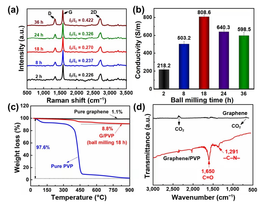 Figure 3. (a) 不同球磨時間制備的 G/WPU 薄膜的拉曼光譜。 (b) 不同球磨時間制備的 G/WPU 薄膜的電導率。 (c) 純 PVP、石墨烯和 G/PVP 的 TGA 曲線。 (d) 原始石墨烯和 G/PVP 樣品的 FTIR 光譜曲線。