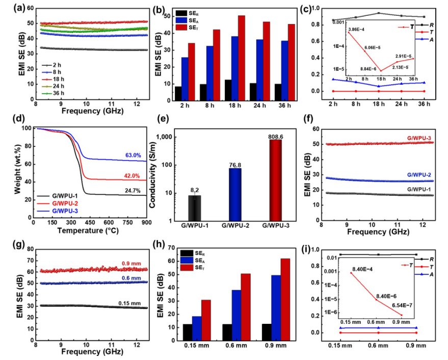Figure 4. (a) 不同球磨時間制備的 G/WPU 薄膜在 X 波段頻率范圍內(nèi)的 EMI 屏蔽性能。 (b) X 波段中平均 SE 吸收、SE 反射和 SE 總和的總結(jié)。 (c) G/WPU 薄膜的反射率 (R)、吸收率 (A) 和透射率 (T) 值的相應功率系數(shù)。 (d) 不同石墨烯含量的 G/WPU 薄膜的 TGA 曲線、(e) 電導率和 (f) EMI SE。 (g) 不同厚度的 G/WPU 薄膜的 EMI SE。 (h) 不同厚度的平均 SE 吸收、SE 反射和 SE 總和的總結(jié)。 (i) 不同厚度的 G/WPU 薄膜的 R、A 和 T 值的對應功率系數(shù)。