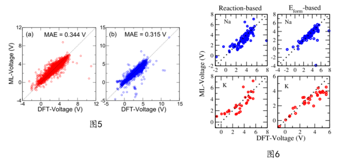 圖5.(a)基于反應(yīng)的模型和(b)基于Eform的模型的DFT(DFT-電壓)與ML(ML-電壓)電壓比較的奇偶圖。圖6. 基于反應(yīng)和基于Eform模型預(yù)測鈉離子和鉀離子電極電壓的性能。
