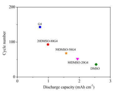 圖 8. 放電容量與具有可調(diào)強(qiáng)度的電解質(zhì)的循環(huán)數(shù)一起繪制。