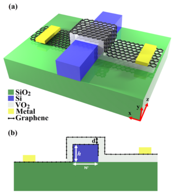 圖 1. (a) 所提出的基于 VO2 的雙層石墨烯調制器的三維和 (b) 截面圖。