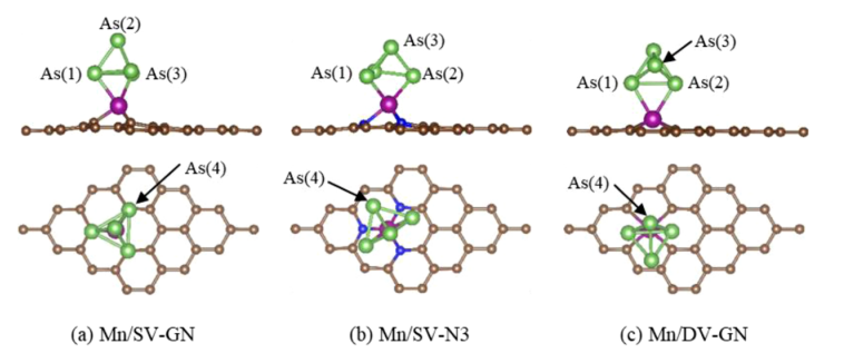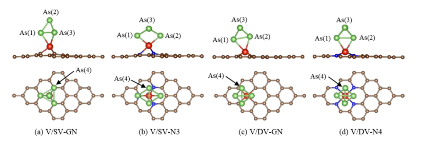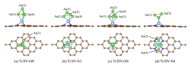 4在不同碳基單原子Ti/V/Cr/Mn吸附劑(氮原子摻雜、單空位和雙空位)表面的吸附特性。分析了單原子吸附劑的幾何形狀、吸附構(gòu)型、吸附能、電子結(jié)構(gòu)、電子密度等數(shù)據(jù)。通過(guò)對(duì)比分析16種吸附劑的計(jì)算結(jié)果,發(fā)現(xiàn)雙缺氮摻雜基底的催化劑具有較高的穩(wěn)定性。通過(guò)對(duì)電荷轉(zhuǎn)移和態(tài)密度的分析,發(fā)現(xiàn)單原子吸附劑催化劑對(duì)As