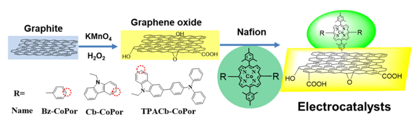 選取三種對稱鈷卟啉,其中位分別為芐基、三苯胺咔唑和咔唑,分別被命名為Bz-CoPor、Cb-CoPor和TPACb-CoPor,涂覆在氧化石墨烯(GO)上作為電催化劑,考察取代基對氧還原反應(yīng)(ORR)的影響。復(fù)合材料的光譜表征表明,卟啉與GO之間存在較強(qiáng)的電子耦合。通過一系列電化學(xué)測量研究了卟啉對ORR的取代效應(yīng),表明在酸性介質(zhì)中卟啉的結(jié)構(gòu)對還原電位、擴(kuò)散限制電流密度、電子轉(zhuǎn)移數(shù)以及H