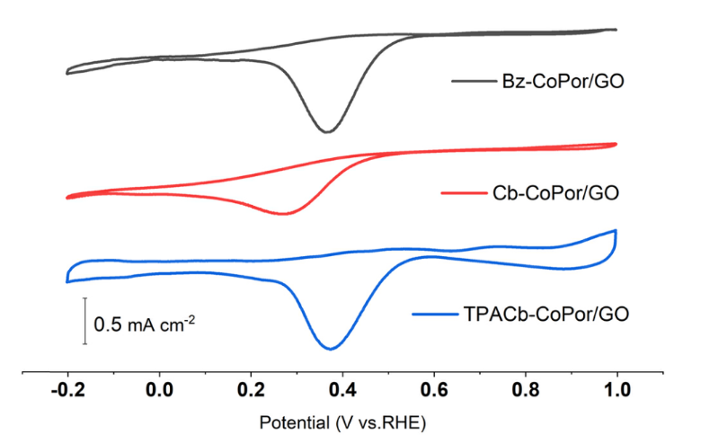 4中測定Bz-CoPor/GO、Cb-CoPor/GO和TPACbCoPor/GO的循環(huán)伏安圖。掃描速率:50 mv s