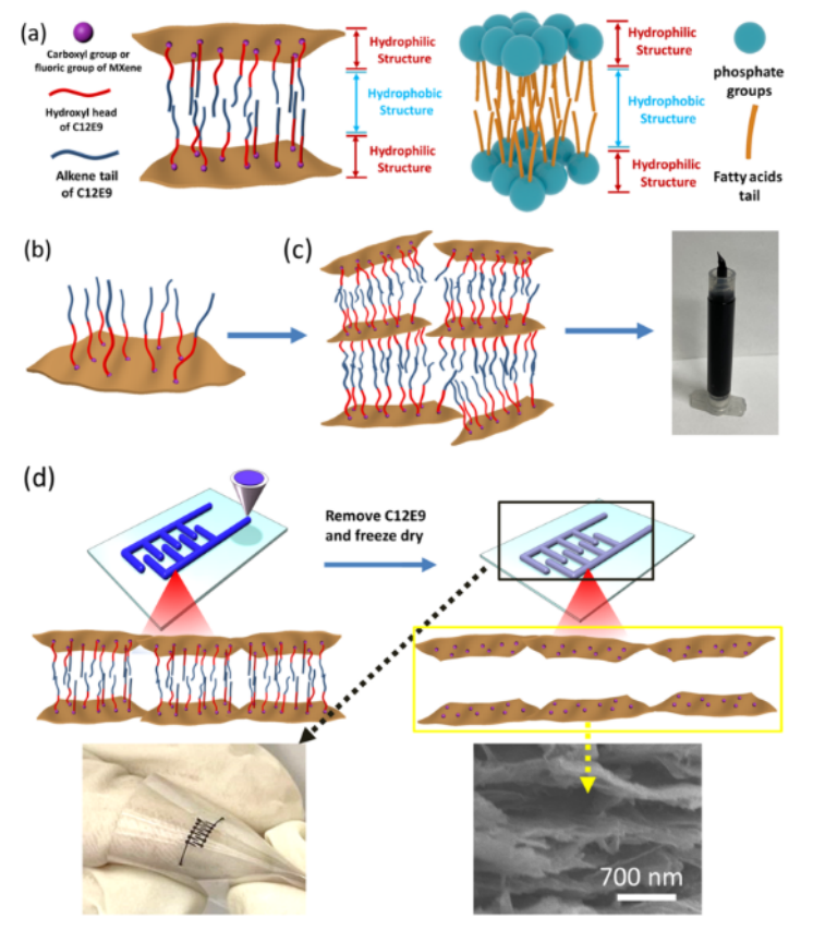 二維材料基水凝膠已廣泛應(yīng)用于各種電子產(chǎn)品的擠出型3D打印油墨。但是,水凝膠油墨的粘度不夠高,無法維持自支撐結(jié)構(gòu)而不發(fā)生建筑變形。使用低粘度水凝膠油墨也很難調(diào)整印刷設(shè)備的微觀結(jié)構(gòu)。通過模擬細(xì)胞膜上的磷脂雙層,將兩親型表面活性劑非乙二醇單十二烷基醚(C12E9)加入到MXene水凝膠中。C12E9的加入提供了MXene薄片的兩親性,并產(chǎn)生了MXene薄片的3D互聯(lián)網(wǎng)絡(luò)。3D互聯(lián)網(wǎng)絡(luò)提供高粘度,均勻的鱗片分布,增強(qiáng)油墨的可打印性。這種油墨有利于MXene薄片在擠壓過程中的對(duì)齊,以及對(duì)齊的微孔和亞微孔結(jié)構(gòu)的形成,從而提高了打印的微超級(jí)電容器的電化學(xué)性能。本研究為微電子學(xué)的可調(diào)諧微結(jié)構(gòu)的制備提供了一個(gè)范例。