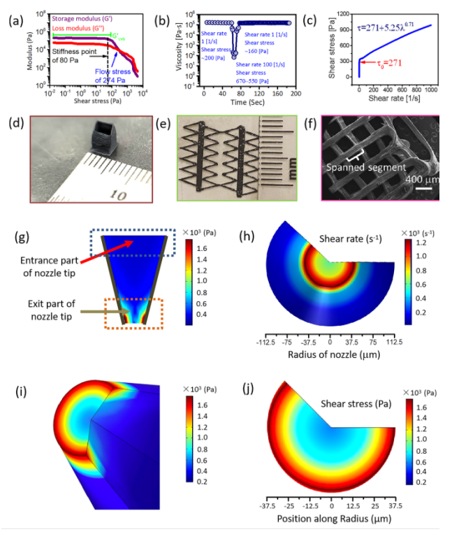 圖2. (a) MXene/C12E9油墨振蕩應(yīng)變函數(shù)的存儲(chǔ)(G’)和損耗(G″)模量。(b)油墨粘度隨時(shí)間的變化。(c)擬合Herschel - Bulkley流體模型的MXene/C12E9油墨剪切應(yīng)力與剪切速率的關(guān)系。(d和e) 3D打印的多層獨(dú)立建筑的數(shù)字照片插圖。(f)具有自支撐微米級(jí)層的3D MXene支架的SEM圖像。 (h)噴嘴尖端墨水的剪切速率分布及其半徑值。3D模型中墨(i)在噴嘴尖端內(nèi)部和(j)在噴嘴尖端出口部分剪切應(yīng)力分布的模擬結(jié)果。