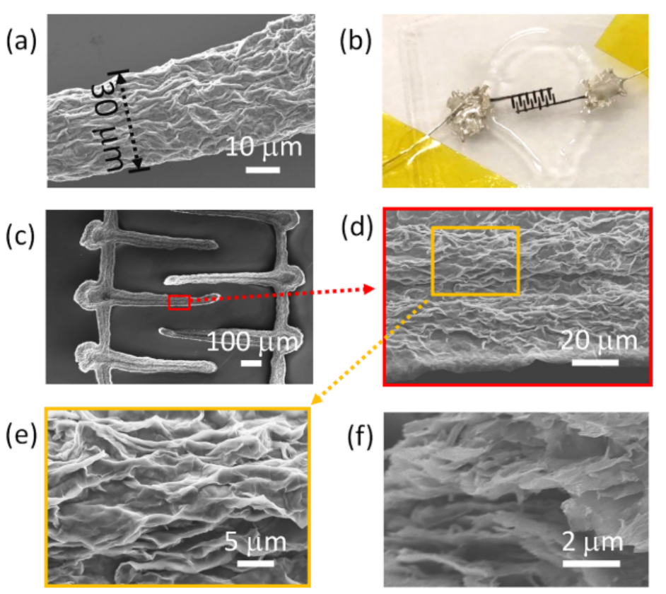 圖3 (a)由寬度為30 μm的MXene/C12E9油墨制成的擠壓MXene絲的SEM圖像。(b)帶有連接電線和電解液的打印MSC的數(shù)碼照片。(c)俯視圖斷層掃描圖像。(d、e)不同放大倍數(shù)的SEM圖像。(f)使用MXene/C12E9油墨打印MXene電極的切割截面表面的SEM圖像。
