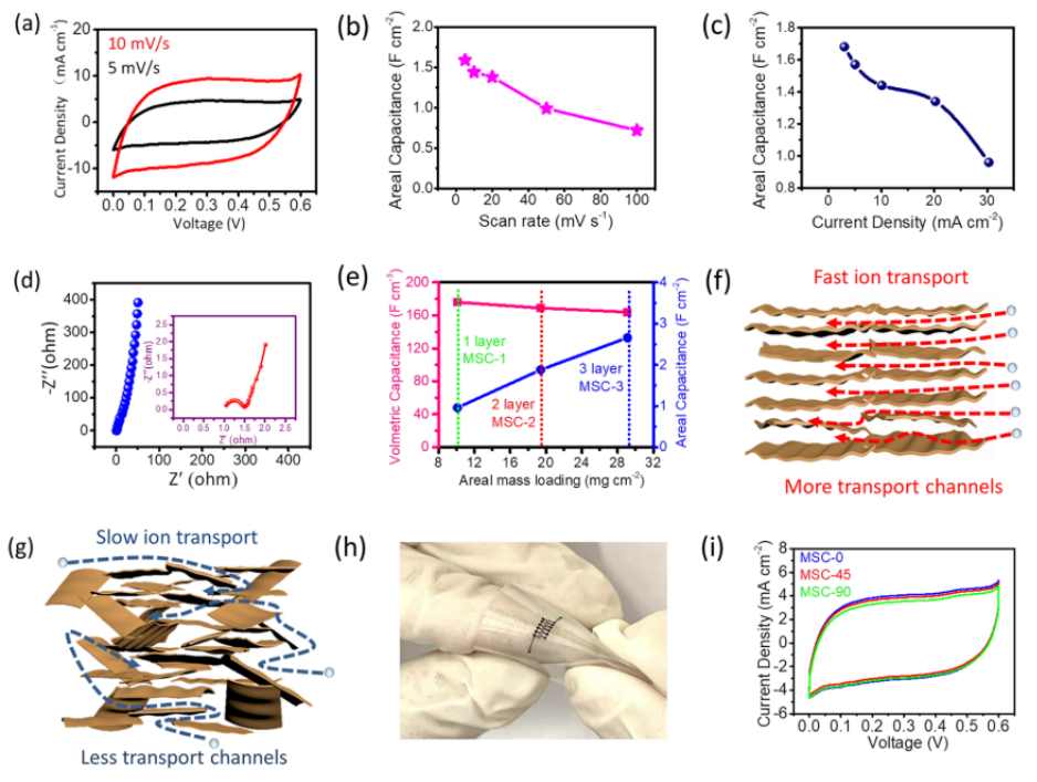 −1掃描速率下5個(gè)周期后的MSCs電化學(xué)阻抗譜數(shù)據(jù)。(e)多層MXene MSCs表現(xiàn)出與厚度無關(guān)的電容。(f和g) MXene電極內(nèi)離子轉(zhuǎn)移路徑的示意圖,(f)排列的薄片和(g)隨機(jī)排列的薄片。(h)質(zhì)量載荷為10.1 mg cm