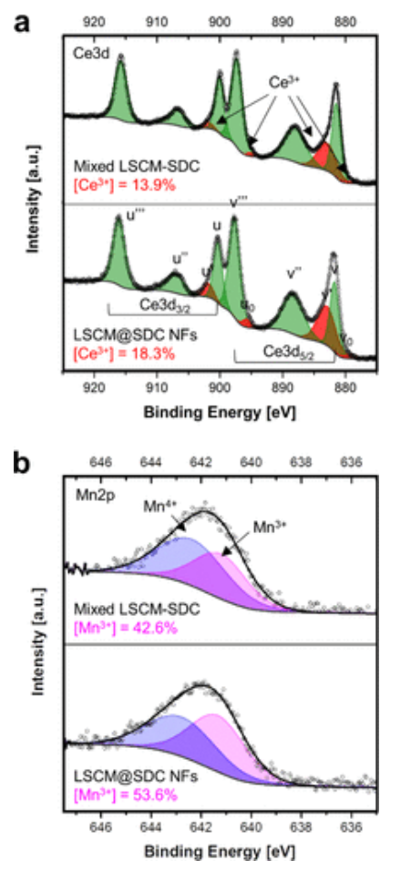 Figure 5. LSCM@SDC復(fù)合納米纖維基陽極和傳統(tǒng)混合 LSCM-SDC 復(fù)合陽極的 XPS 光譜:(a) Ce 3d 光譜和 (b) Mn 2p 光譜。