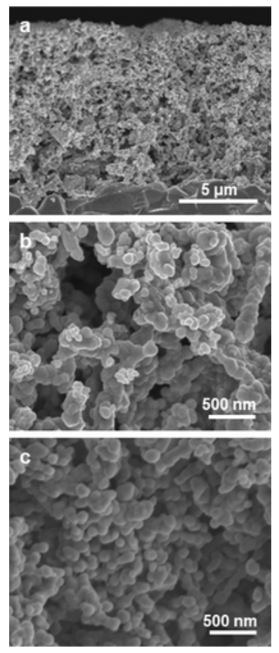 Figure 6. (a) 橫截面 SEM 圖像和 (b) LSCM@SDC復(fù)合納米纖維基陽極的放大圖像。(c) LSCM@SDC復(fù)合納米纖維基陽極在阻抗譜測量約 100 小時后的 SEM 圖像。